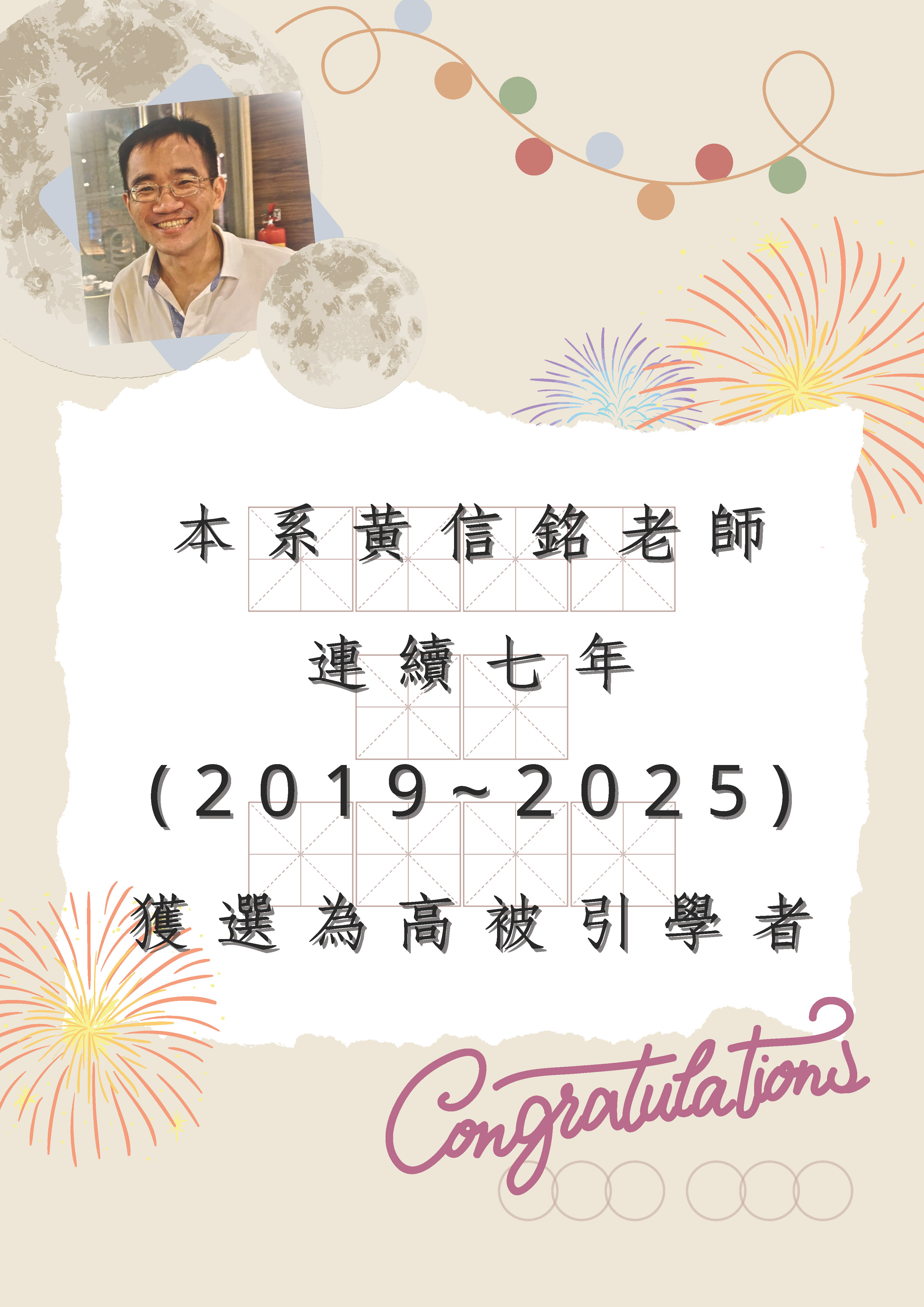 賀本系黃信銘老師連續七年(2019-2025)獲選為高被引學者