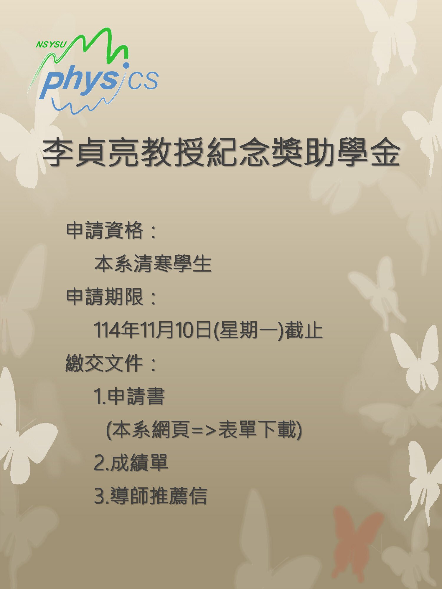 114學年度物理系李貞亮教授獎助學金開始受理申請(114/11/10截止)
