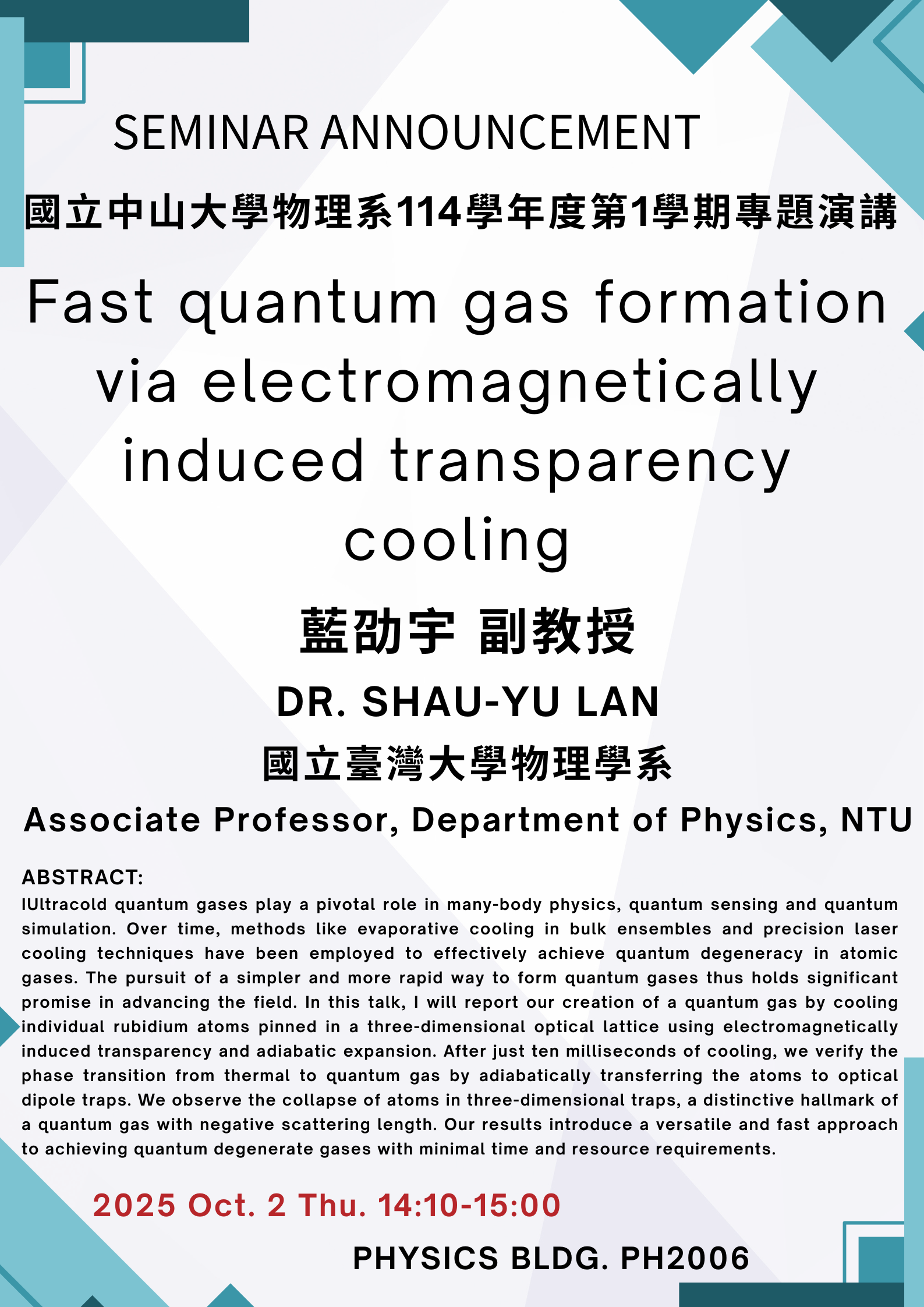 物理系本週演講114.10.2:藍劭宇 副教授
