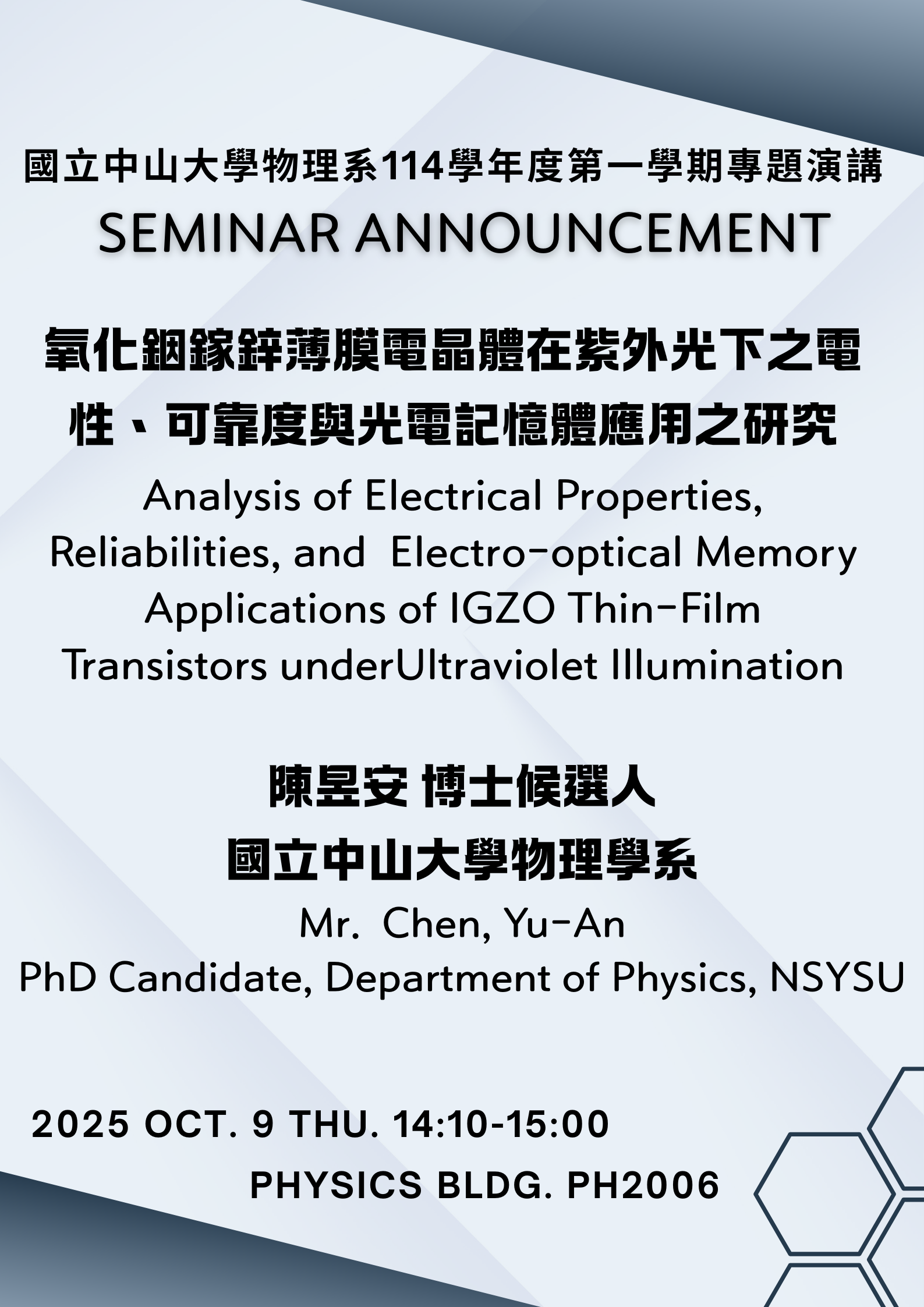物理系本週演講(1)114.10.9 : 陳昱安 博士候選人