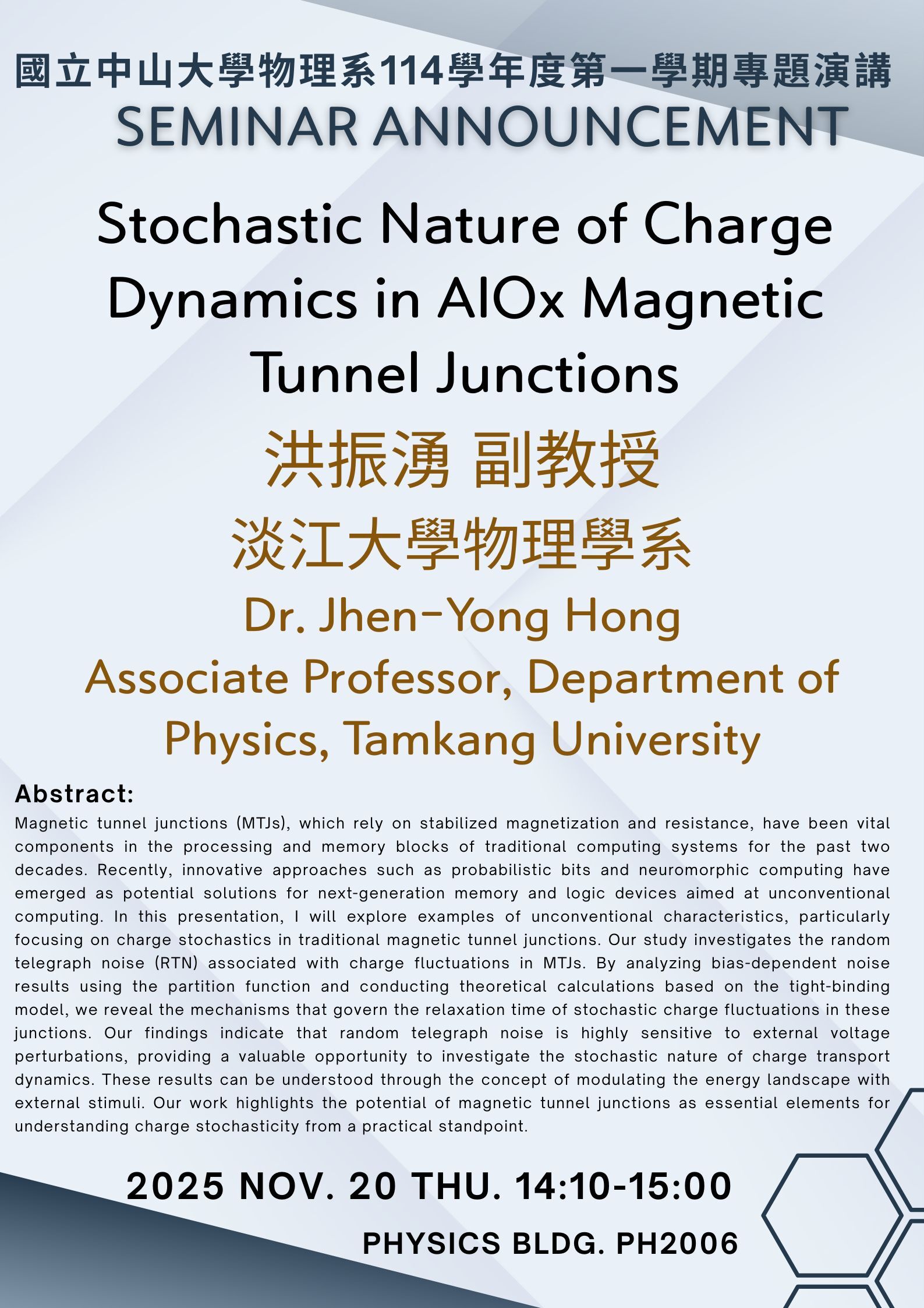 物理系本週演講114.11.20 : 洪振湧 副教授