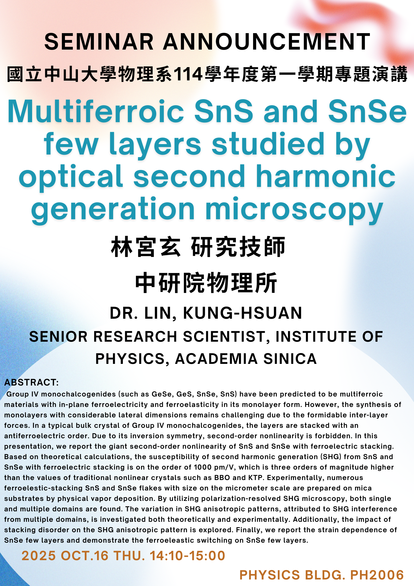 物理系本週演講114.10.16 : 林宮玄 研究技師